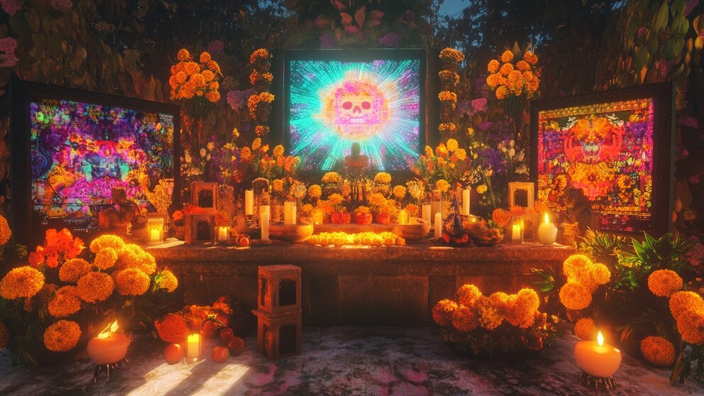 Las ofrendas podrían incorporar tecnologías avanzadas, como hologramas que representen a los difuntos o elementos interactivos que permitan contar historias o anécdotas de sus vidas. Es por esto que en la imagen de aproximación se puede ver que las fotos se han sustituido por hologramas e imágenes con luz neón.