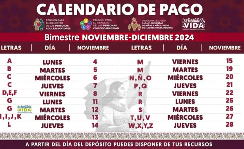 Para facilitar el acceso a estos recursos, la Secretaría ha implementado un calendario de pagos que inició el 4 de noviembre con las personas cuyo primer apellido comienza con la letra “A” y finalizará el 28 de noviembre con aquellos cuyos apellidos inician con las letras W, X, Y y Z. Este lunes 11 de noviembre, recibirán su depósito los beneficiarios con apellidos que inician con G.