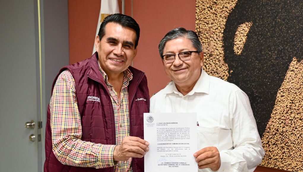 Xalapa, Ver., 13 de noviembre de 2024.- El presidente de la Junta de Coordinación Política de la LXVII Legislatura, diputado Esteban Bautista Hernández, entregó al periodista Esaú Valencia Heredia el nombramiento que le acredita como titular de la Coordinación de Comunicación Social del Congreso del Estado de Veracruz.