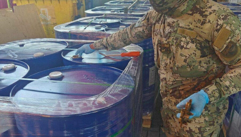 De acuerdo con datos del Gobierno de México, en la Aduana de Manzanillo se han asegurado en este año 16 mil kilos de cloruro de sencillo, 5 mil 400 litros de tequila contaminada con metanfetamina; 7 mil 322 kilos de propionyl chloride; 88 mil 586 kilos de ácido acético glacial y 13 mil kilos de botellas de aceite de aguacate contaminadas con metanfetamina.