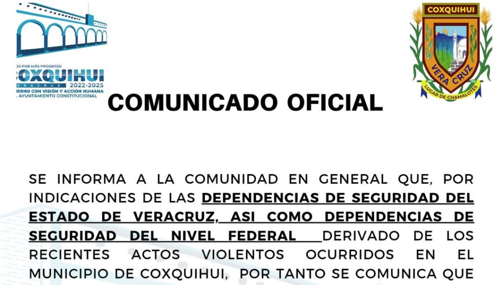 Xalapa, Ver.- El Ayuntamiento de Coxquihui canceló cualquier evento masivo luego de los hechos de violencia que se han registrado en el municipio.