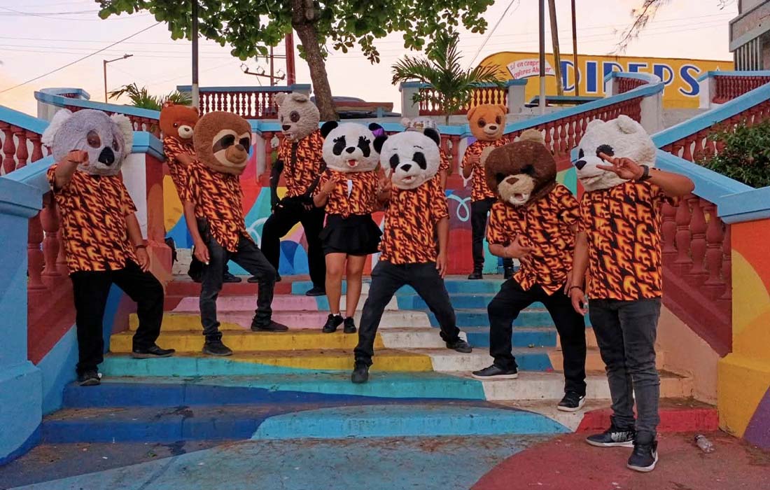 máscaras de osos que utilizan para sus presentaciones, además de un par de congas, dos timbales, una tarola, tres platillos, dos teclados, un keytar, así como un acordeón, un saxofón, una trompeta, y un trombón.