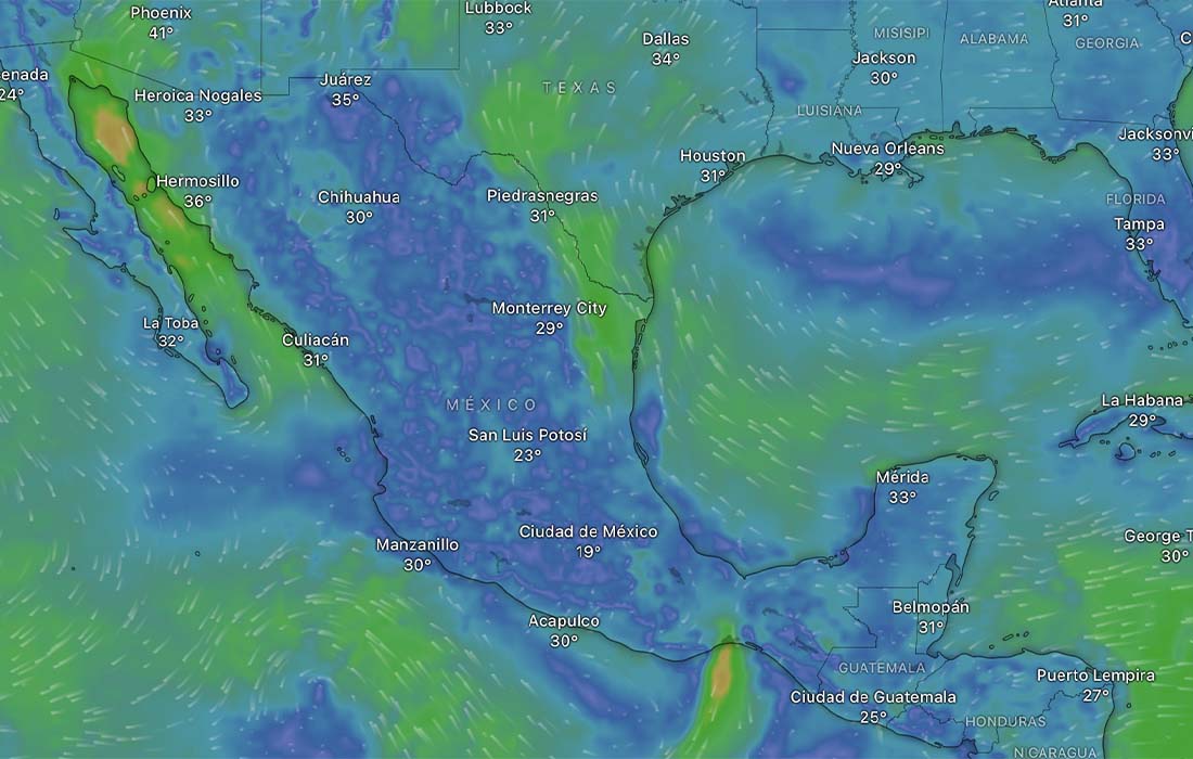 Continúa el ambiente cálido a muy caluroso sobre entidades del Noroeste y Norte en especial Baja California y Sonora donde se prevén temperaturas máximas puntuales en la región fronteriza de más de 45 °C.