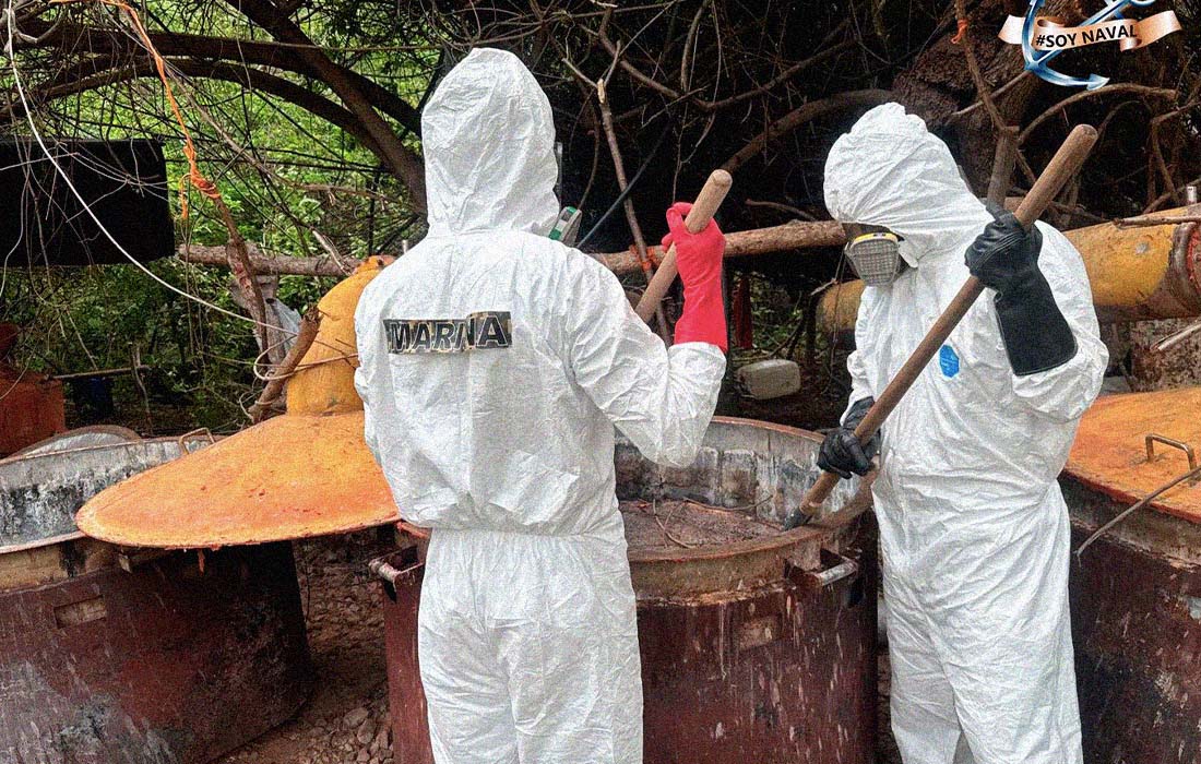 Fuerzas federales neutralizaron un laboratorio localizado en un poblado Sinaloa, donde se aseguró casi una tonelada de metanfetamina
