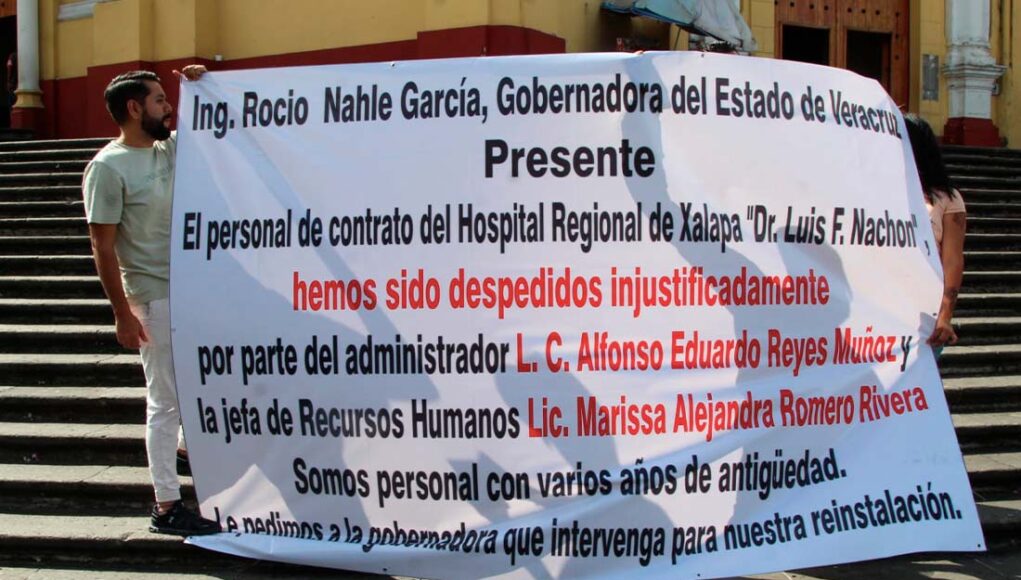 Xalapa, Ver.- Ex trabajadores del Hospital Civil “Doctor Luis F. Nachón”, se manifestaron en la plaza Lerdo para denunciar que fueron despedidos de forma injustificada, por lo que acusaron al área de Recursos Humanos los despidió el viernes pasado sin previo aviso e incluso los sacaron con apoyo de policías, a pesar de que muchos tenían antigüedades de hasta 10 años.