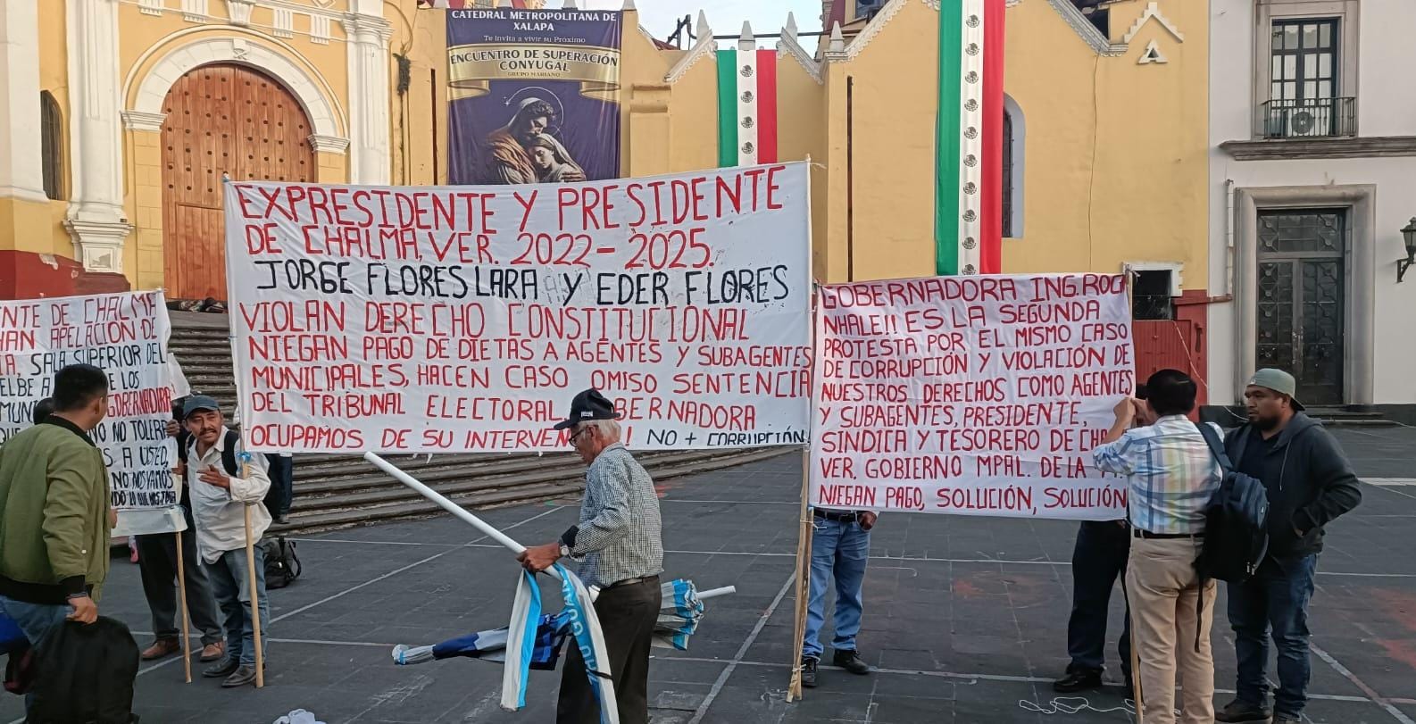Xalapa, Ver.- Agentes municipales del municipio de Chalma se manifestaron en la plaza Lerdo para exigir el pago de sus remuneraciones, que datan desde 2022 hasta 2025.