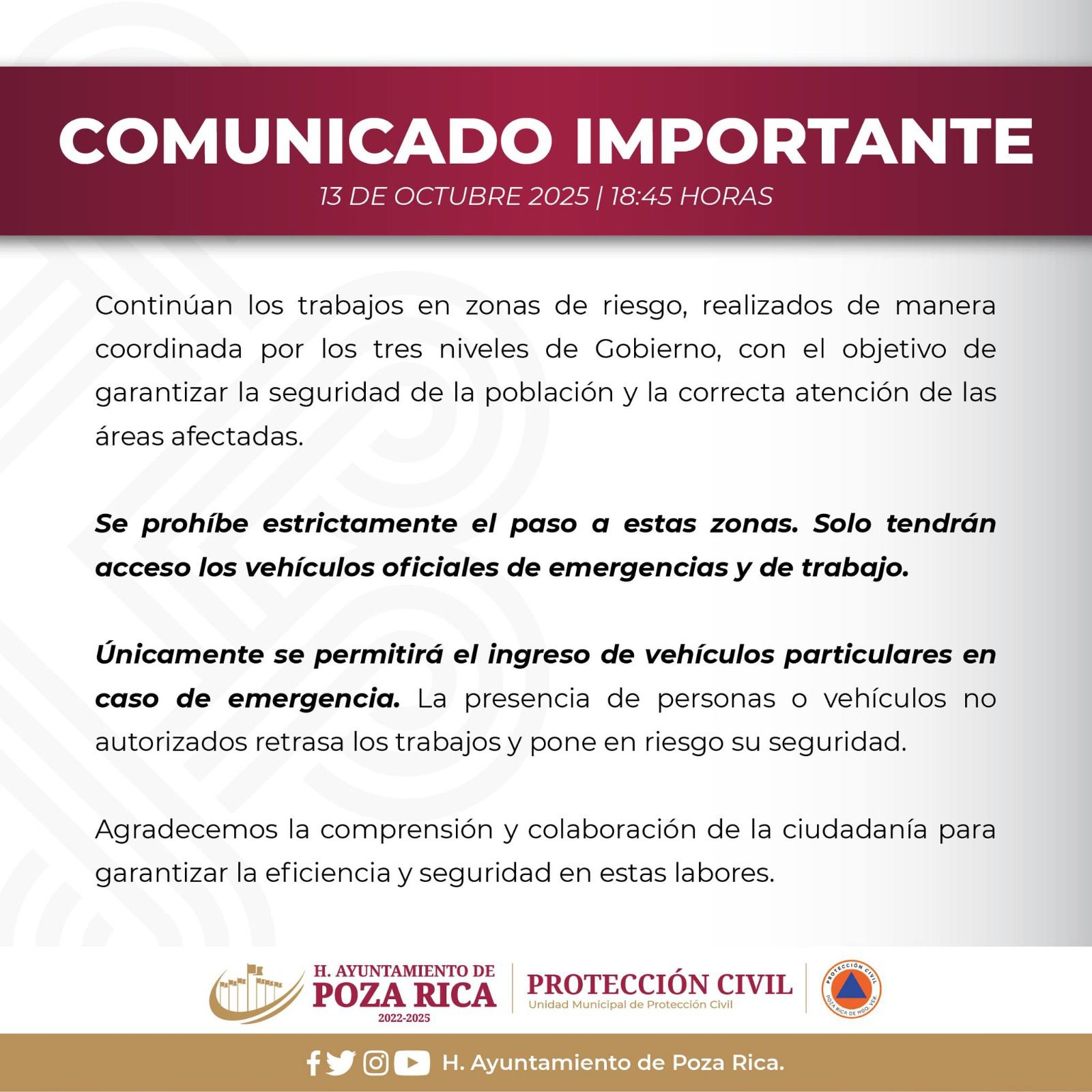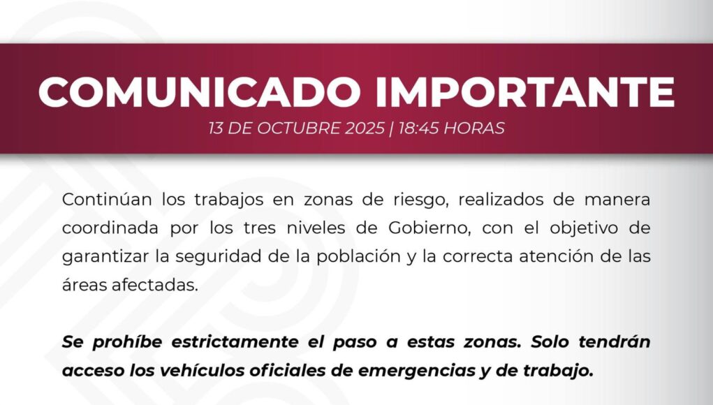Ahora, el Ayuntamiento de Poza Rica emite el comunicado para informar que “la presencia de personas o vehículos no autorizados retrasa los trabajaos y pone en riesgo su seguridad”.