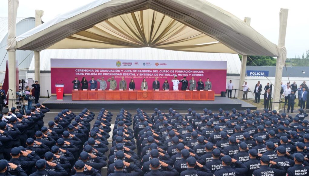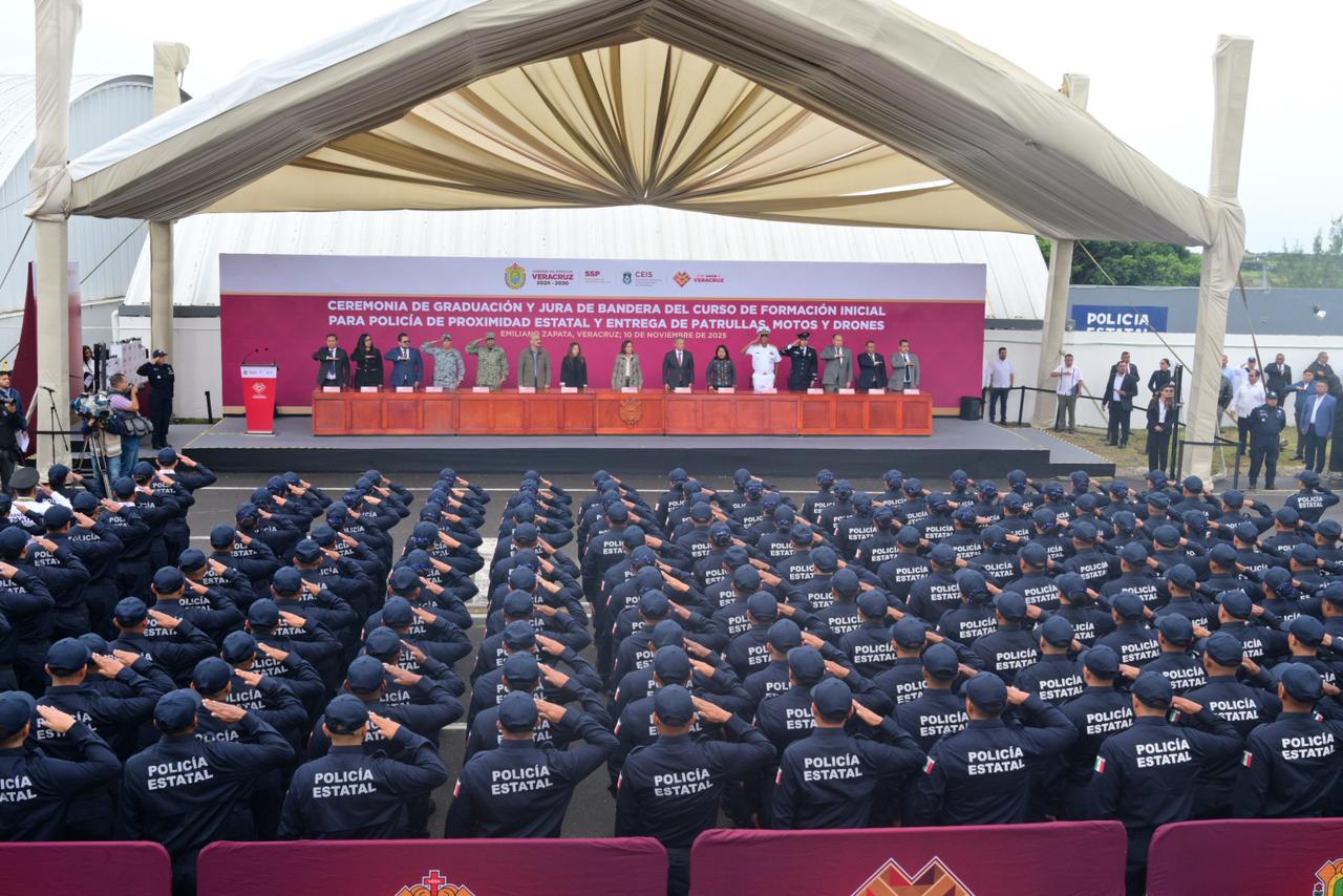 Xalapa, Ver., 10 de noviembre de 2025.- En representación de la LXVII Legislatura del Estado de Veracruz, la presidenta de la Mesa Directiva, diputada Naomi Edith Gómez Santos, acudió a la Ceremonia de Graduación y Jura de Bandera del Curso de Formación Inicial para Policía de Proximidad Estatal y Entrega de Patrullas, Motos y Drones, encabezada por la gobernadora de Veracruz, Rocío Nahle García. La inversión, que supera los 200 millones de pesos, fortalece las capacidades operativas de la fuerza policial e impulsa la Estrategia Estatal de Seguridad para mantener la paz en Veracruz.